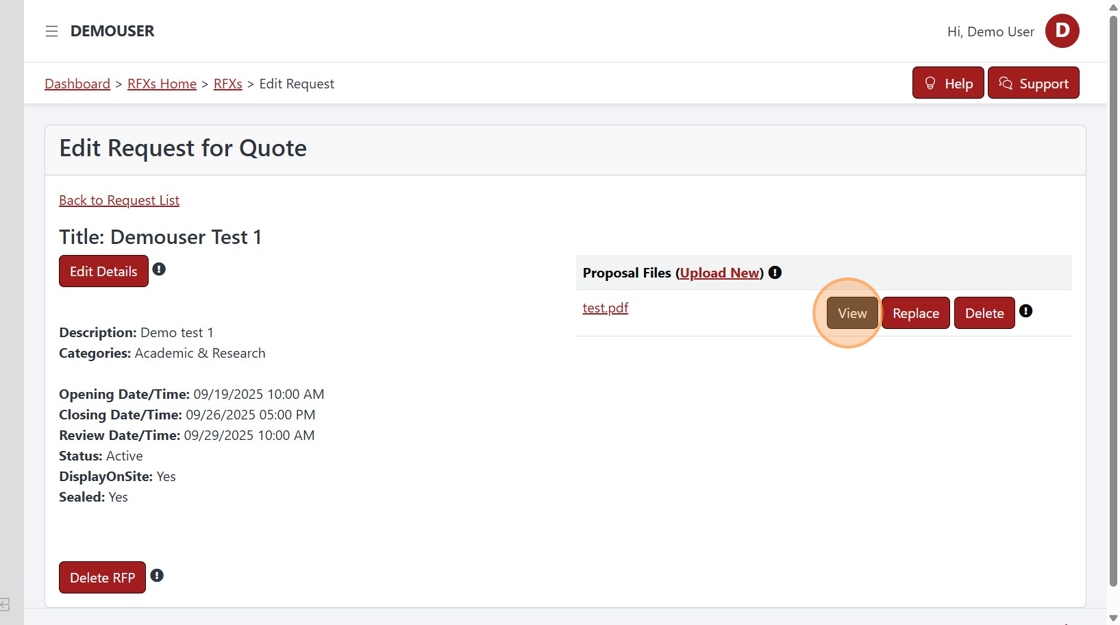 8. Click "Delete RFP" to delete the request permanently. This is only available until a submission is made by a vendor.